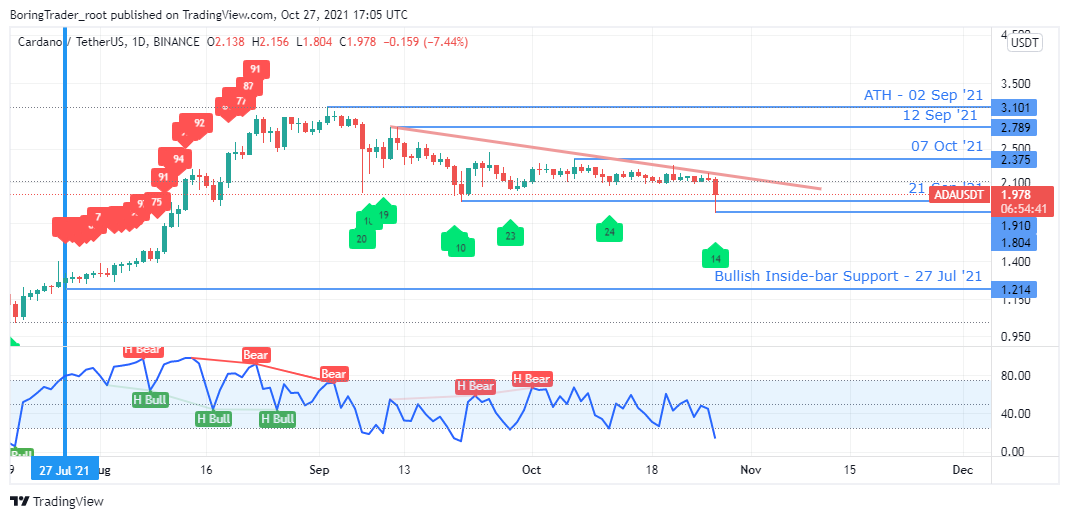 O quadro diário acima mostra que o ADAUSDT entra em formação de gráfico de triângulo descendente após uma tendência de aumento prolongada em 27 de julho de 2021.