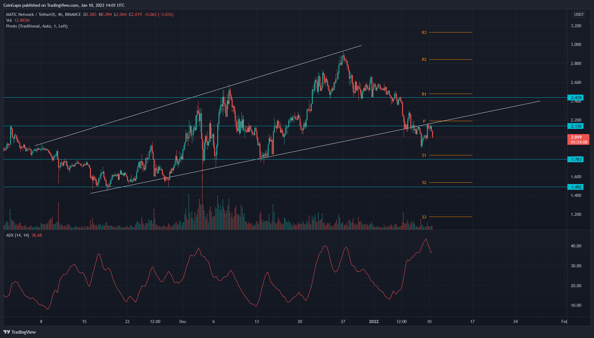 O pivot tradicional sugere que os níveis de resistência importantes para o preço da MATIC são de US$2,18, seguidos de um nível horizontal de US$2,5 no gráfico de 4 horas. Entretanto, os níveis de suporte são de US$1,8 e US$1,5.