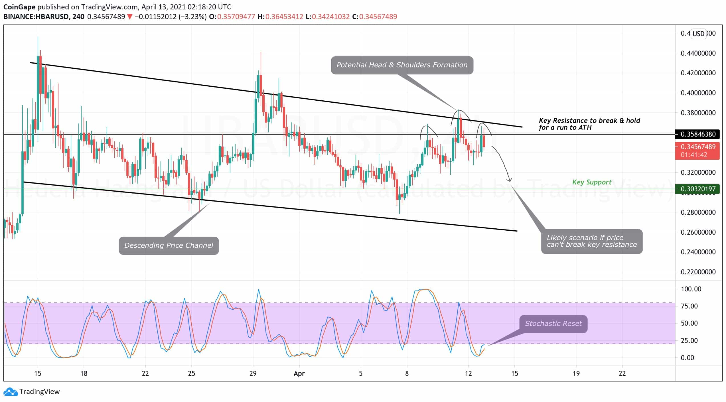 - O preço do HBAR pode cair para US$0,30 se os baixistas conseguiram o controle abaixo da resistência chave