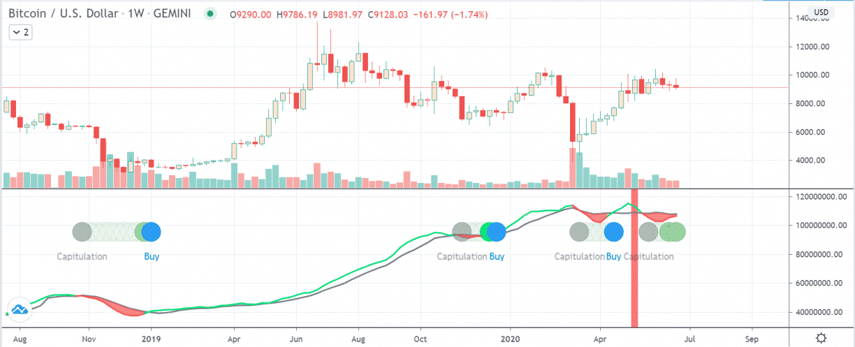 Outro indicador popular, Banda de Dificuldade do Bitcoin, apenas mede as médias móveis da dificuldade da rede do Bitcoin. De acordo com Willy Woo (o criador do Indicador da Banda de Dificuldade) que com frequência tem uma posição de longo prazo, comprar deveria começar com a própria capitulação. Ele tweetou no passado,