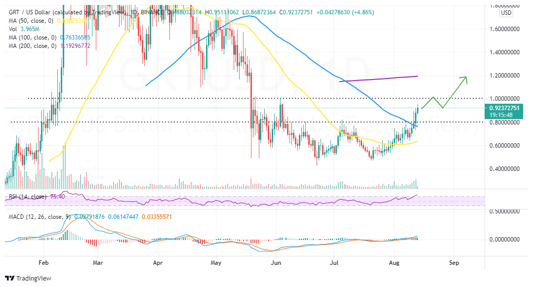 The Graph tem mais de dois dígitos de ganhos em 24 horas para negociar em US$0,92. O token tem estado em um movimento ascendente desde julho, e tendência ascendente ainda está intacta. Talvez um rompimento acima da SMA de 100 dias tenha mantido o interesse dos investidores elevado, enquanto o aumento da procura do token só aumenta o valor.