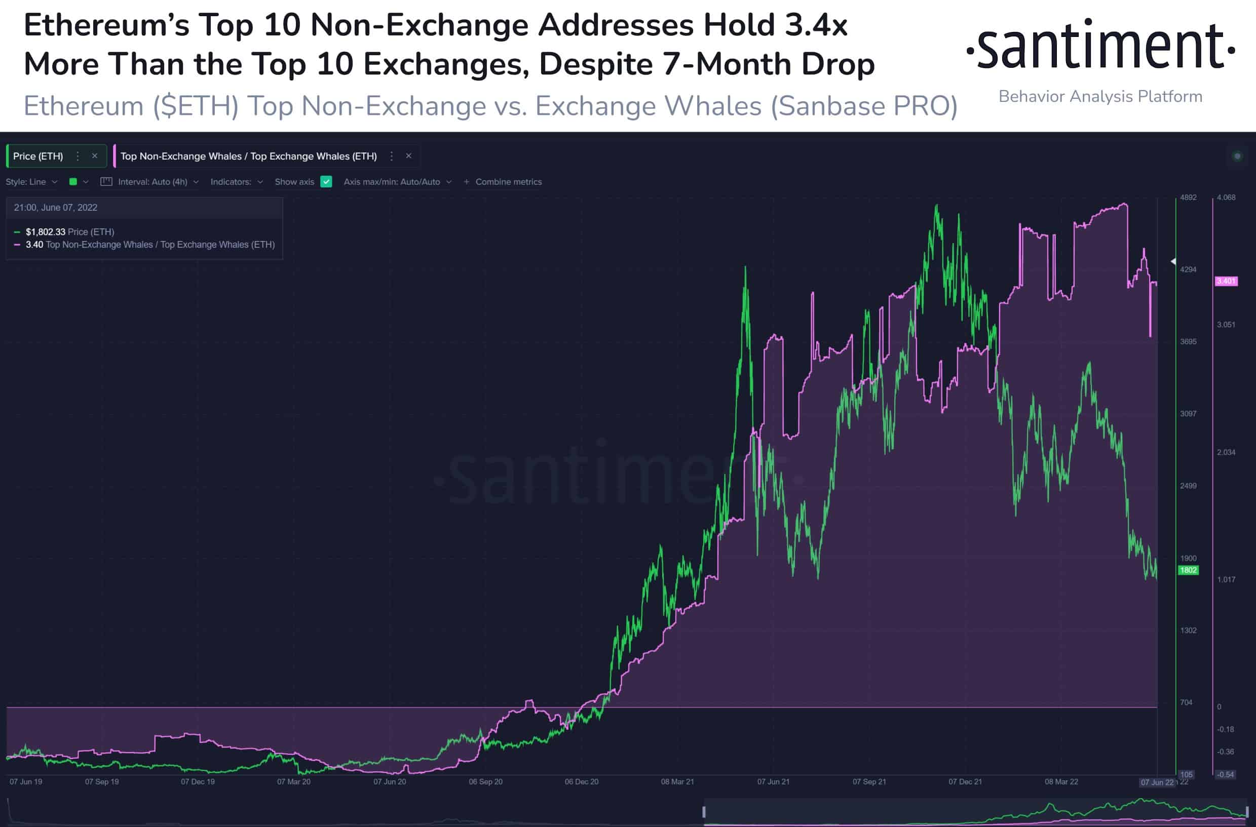 “Os 10 principais endereços de não exchange vs. exchange da Ethereum estão mantendo uma alta proporção de ETH de propriedade sobre as 10 principais baleias não exchange. Com um tremendo 3,4x mais moedas detidas, ainda parece haver uma crença de que os preços podem estabilizar.”