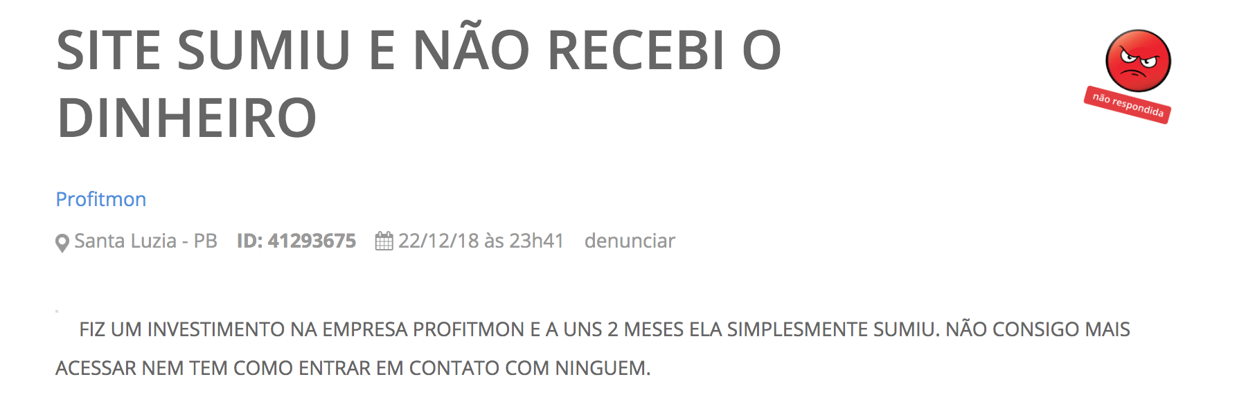 A empresa Profitmon é a suposta pirâmide financeira divulgada pela gerente, site da empresa saiu do ar e não pode mais ser encontrado na WEB, de acordo com denúncia de ex-cliente pelo site do Reclame aqui. Segundo investidores, a Profitmon prometia lucros garantidos de até 3% ao dia, o que é um rendimento extremamente agressivo e muito acima do mercado de uma forma geral.